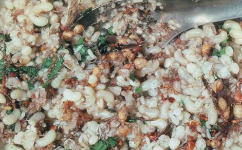 В разное время года бушмены находят съедобные личинки насекомых, муравьиные яйца, медоносные соты. Из семян, скапливающихся в муравейниках, бушмены варят кашу. Лакомство — жареная саранча.