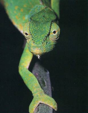 Существуют хамелеоны длиной и полметра, а есть крошки, еле доросшие до 4 см. Облик у этих любопытных животных своеобразный. Пальцы на лапах расположены двумя противопоставленными друг другу группами, в которых они до предпоследних фаланг заключены в общий кожаный чехол. Каждая группа объединяет два или три соседних пальца, причём на передних лапах три собранных вместе пальца обращены внутрь, а на задних — наружу. Так стопа и кисть преобразуются в клешни, удобные для обхватывания тонких ветвей. Толстый у основания и постепенно сужающийся к концу хвост хамелеона может спирально закручиваться вниз и обвиваться вокруг ветвей. Слух у хамелеонов отвратительный — барабанная перепонка отсутствует, и они не воспринимают звуки, передающиеся через воздух.