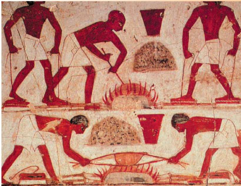 На египетской фре­ске, созданной око­ло пяти тысяч лет назад, запечатлен процесс подготов­ки медной руды к плавке. Руду из­мельчали, просе­ивали и прокали­вали на открытом огне. Уже тогда люди овладели сложными технологиями и знаниями и научились пере­давать их из поко­ления в поколение.