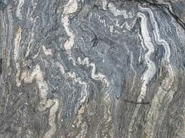 Гнейс — тоже метаморфического происхождения. Некоторые гнейсы зарождаются из гранита — магматической породы, но изменены под действием тепла и давления. Многие образцы гнейсов имеют уплощенные зерна минералов, которые приобрели гладкую поверхность при высокой температуре и давлении и ориентировались в виде перемежающихся горизонтальных прослоев.
