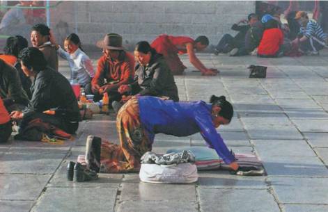 Путь его лежит по священной улице Лингкор. Проходя по ней круг, паломник совершает не одну сотню падений. С каким-то благоговейным трепетом наблюдаешь за всем этим. И хотя у человека на руках рукавицы, а на коленях — специальные наколенники, вряд ли на его теле не остаётся ушибов и ссадин после стольких падений.