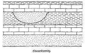• параллельное несогласие имеет параллельные плоскости напластований выше и ниже перерыва в осадконакоплении с видимой неровной эрозионной поверхностью между ними;