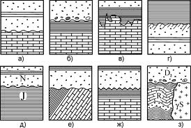 Различают четыре основных типа стратиграфических несогласий. К ним относятся угловое несогласие, параллельное несогласие, гете-ролитическое несогласие и скрытое несогласие. Эти отсутствующие части мозаики обнаруживаются во множестве различных условий. Характерные различия между этими типами описаны ниже: