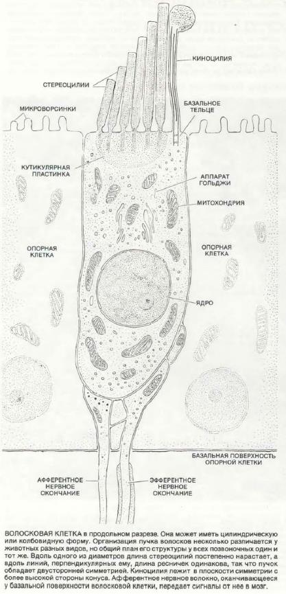 Волосковые клетки чувствительны к очень слабым раздражителям. Например, волосковые клетки млекопитающих начинают реагировать, когда кончик пучка волосков сдвигается всего лишь на 100 пкм — это расстояние сравнимо с диаметром ряда атомов. Запись активности изолированных волосковых клеток показала, что для каждой есть какое-то одно направление пучка волосков, когда рецептор максимально чувствителен. Если пучок волосков перемещают в различных направлениях, клетка реагирует только на ту составляющую движения, направление которой совпадает с направлением максимальной чувствительности. Цитофизиологические данные вместе с результатами световой и электронной микроскопии подводят нас все ближе к пониманию механизма рецепции во внутреннем ухе. Тем не менее остается много неясных вопросов; один из наиболее интригующих: каков конкретный молекулярный механизм, с помощью которого в результате смещения пучка волосков изменяются электрические свойства клетки и возникает идущий в мозг информационный сигнал?