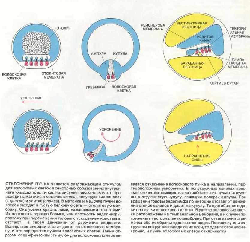Плотность отолитов во много раз больше, чем плотность эндолимфы в маточке и мешочке. Поэтому при ускорении отолиты вследствие инерции отстают от движения эндолимфы. Их давление на отолитовую мембрану передастся пучкам волосков. Волосковая клетка при этом механически раздражается: верхушка пучка волосков смещается в направлении, противоположном направлению ускорения.